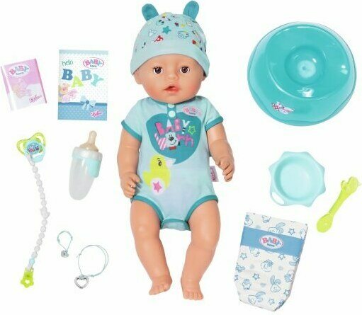 Popis produktuInteraktiivinen BABY born® -poikanukke. Nukkea voi kylvettää, juottaa, syöttää ja hän itkee oikeita kyyneleitä. Nukella on päällään ihastuttava vaaleansininen body ja pipo ja bodyn alla vaippa. Nuken silmät sulkeutuvat makuuasennossa. Navassa on nappi, jolla potalla käyminen helpottuu ruokailun jälkeen. Nuken pituus on 43 cm.
