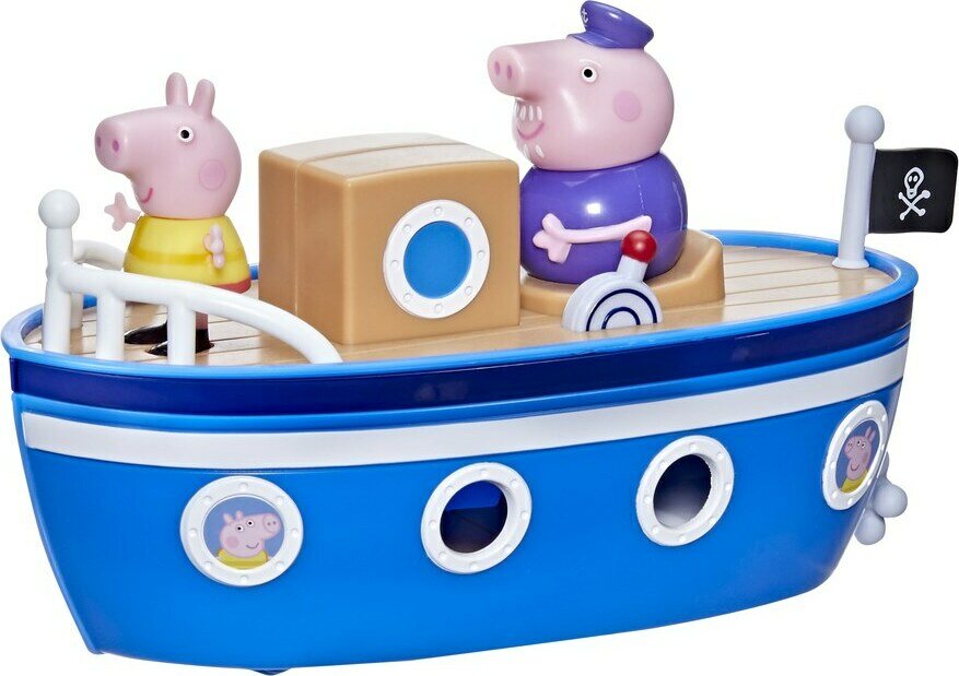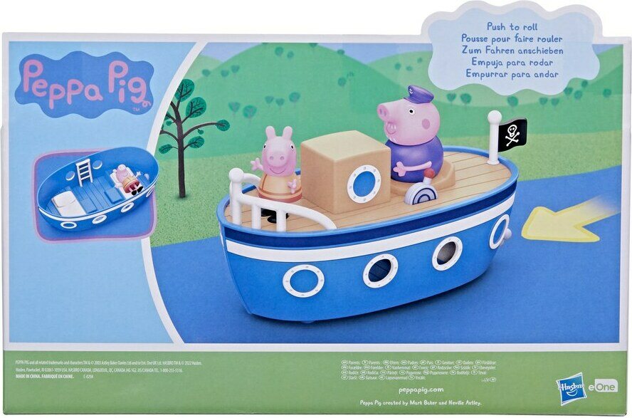 Sisältää: Kiinteän Ukki -kapteeni hahmon, Pipsa Possu hahmon. Hahmojen koko 7,5 cm. Veneessä pyörät ja yläkansi irroitettava.
