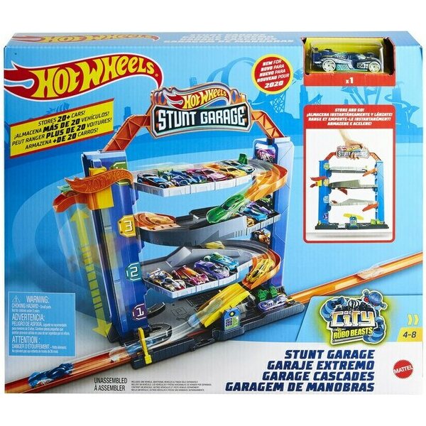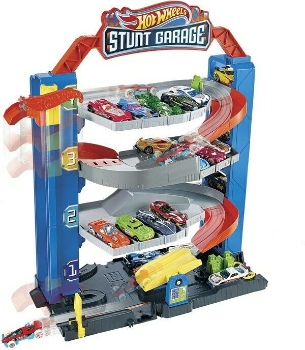 Tässä parkkitalossa ei tyydytä ajamaan rataa pitkin alas, vaan siirtyminen tasolta toiselle tapahtuu hyppäämällä. Parkkitalossa on tilaa 20 autolle. Yhdistettävissä muihin Hot Wheels City -osiin. Sisältää yhden auton. Ikäsuositus yli 4-vuotiaille.
