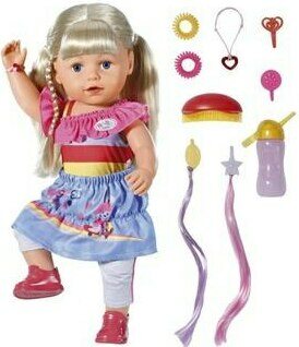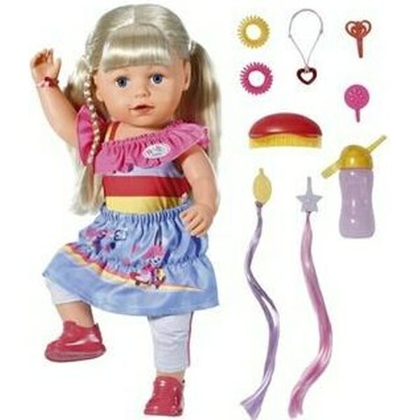 Baby Born isosiskolla on vaaleat pitkät hiukset. Pakkauksessa mukana mm. hiusharja, ponnarit, irtohiusklipsit ja juomapullo nukelle. Korkeus 43cm Ikäsuositus 3+