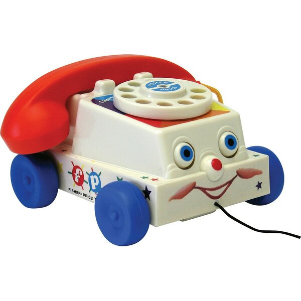 Fisher Price Toys lankapuhelin. Lankapuhelinta pystyy vetämään perässä, sillä siinä on pyörivät siniset renkaat ja naru edessä. Ikäsuositus 1+ vuotta.