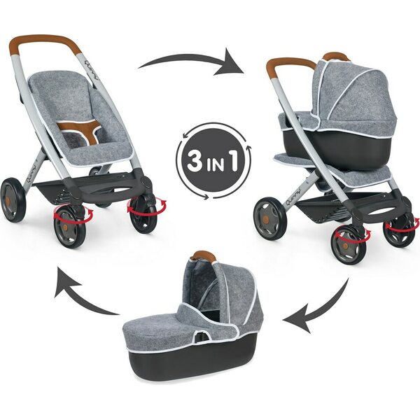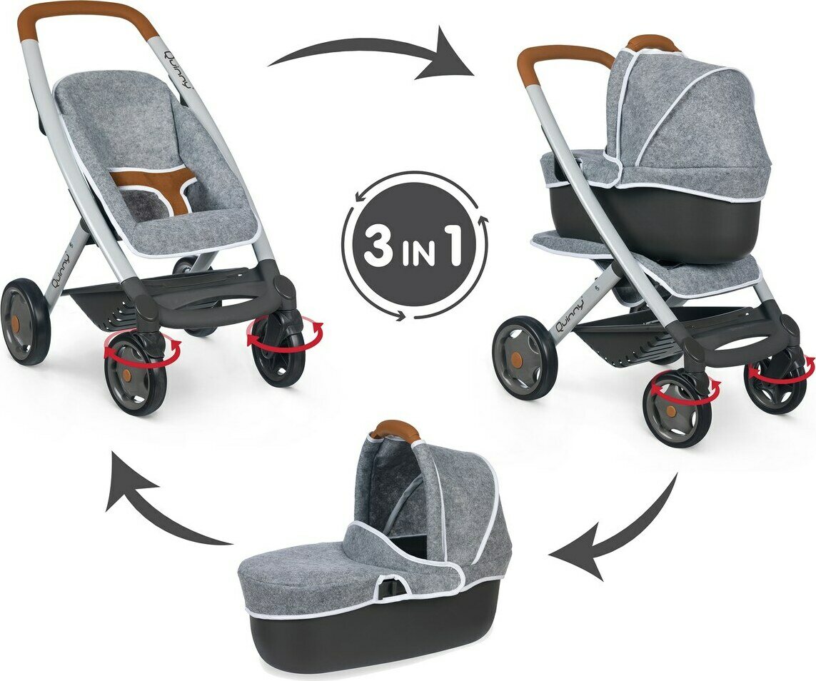 Quinny 3 in 1 nukenvaunut toimivat myös rattaina tai vaunukoppana. Istuinosassa turvavyö , kääntyvät renkaat ja alaosassa kätevä tavaratila. Vaunujen koko 38,5 cm x 54,5 cm x 64 cm ja sopii maksimissaan 42 cm kokeiselle nukelle.