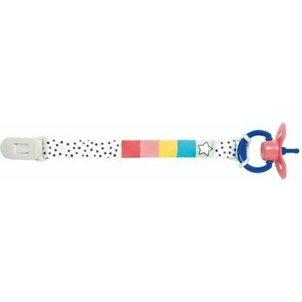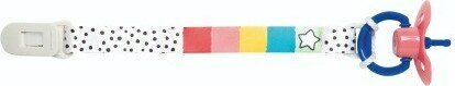 Raikkaan väriset raidat ja pilkut koristavat nuken tuttinauhaa. Nauhassa klipsikiinnitys. Nauhaan voi vaihtaa minkä tahansa renkaallisen tutin. Ikäsuositus 3+.