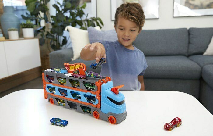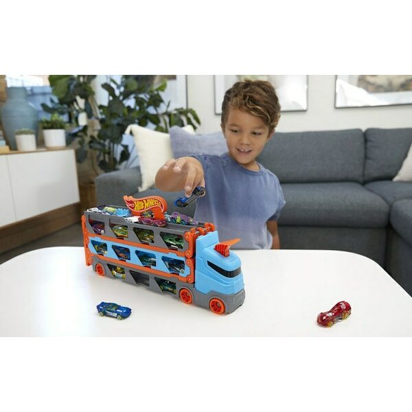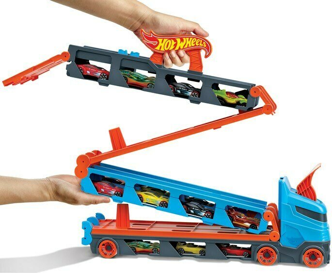 Säilytä tai kuljeta vaikka 20 Hot Wheels -autoa kerralla tällä upealla rekalla. Avaa rekka ja edessäsi on upea, lähes 2 m pitkä rata, jolla voit kisata rinta rinnan kaverisi kanssa. Kumman auto kiitää voittoon? Pakkauksessa rekka ja 3 HW -autoa. 3 +.