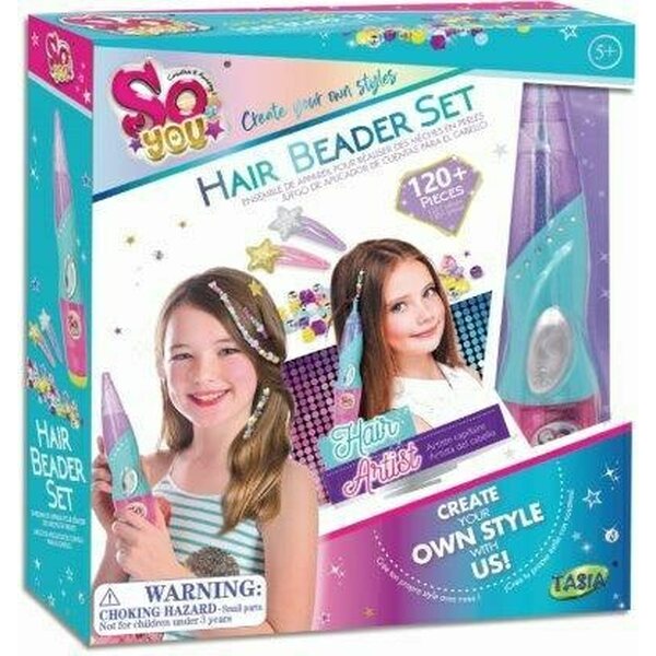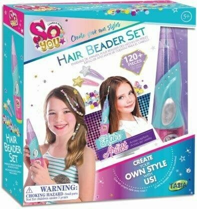 Hiusten helmitys setti. Setin mukana helmikone, hiuspinnejä, 120 helmeä ja stoppereita. Mukana myös käyttöohjeet.
