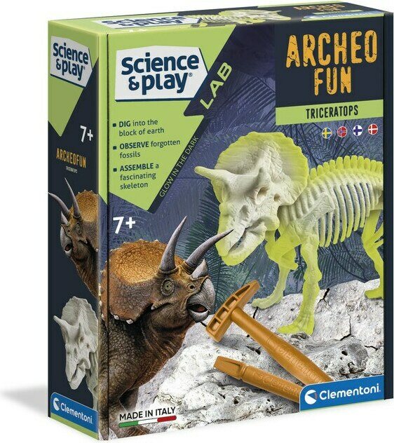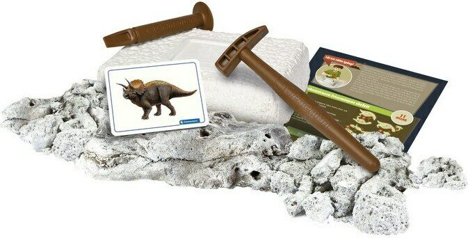 Kaiva maata varovasti ja paljasta sieltä legendaarisen Triceratopsin pimeässä hohtava luuranko! Lataa mobiilisovellus pakkauksen ohjeen mukaisesti, niin leikki saa uusia ulottuvuuksia. Sisältää maa-aineksen, luurangon, vasaran ja hakun. 7+