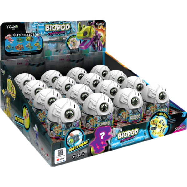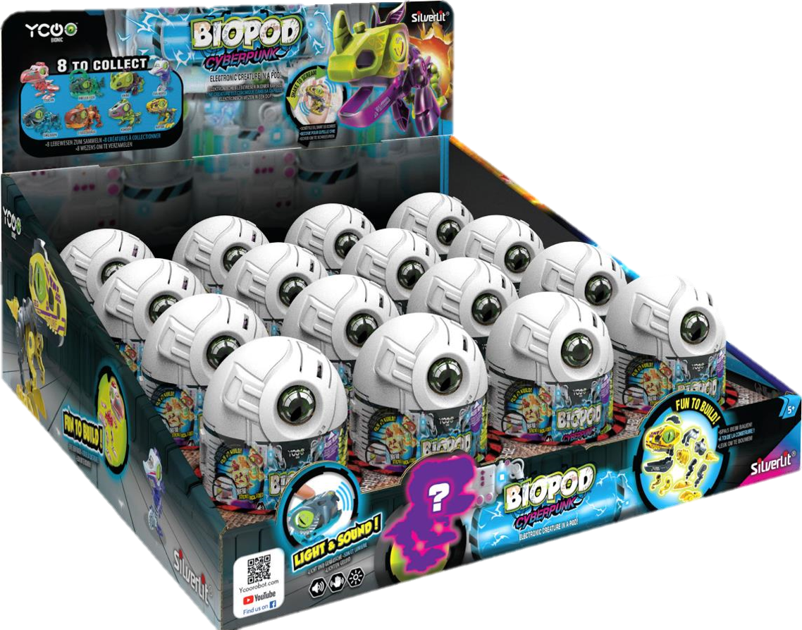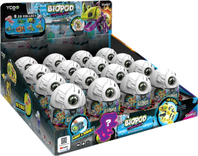 Biopod Cyberpunk Single Pack 16 kpl Display. Biopod Cyberpunk. Kapseli sisältää pimeässä hehkuvan koottavan roboottidinosauruksen. 5+