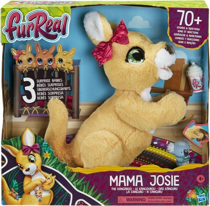 Suloinen kenguruemo Mama Josie, jolla kolme pientä poikasta. Avaa pakkaus ja ota selvää ovatko poikaset tyttöjä vai poikia. Syötä kengurulle smoothieta ja kuulet syöntiääniä. Kenguru hoivaa poikasiaan. Yli 70 ääni- ja liiketoimintoa. Ikäsuositus 4+.