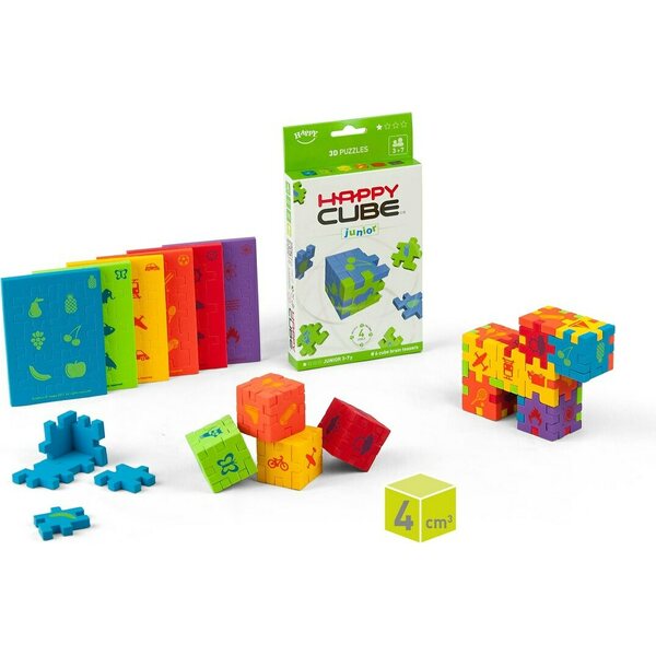 Happy Cube Junior 6 pack. Sisältää kuusi erilaista pulmakuutiota. Pakkaus sisältää haasteita neljässä eri vaikeustasossa. Pulmapelit kehittävät monipuolisesti erilaisia taitoja ja loogista ajattelua.