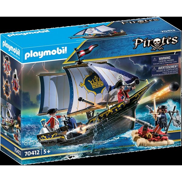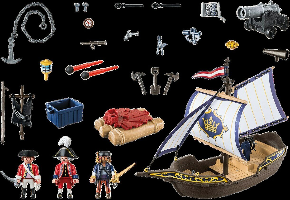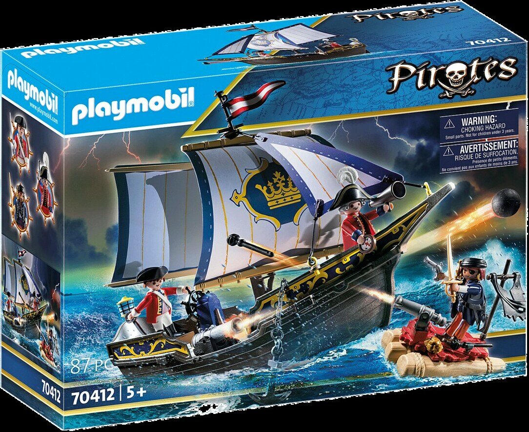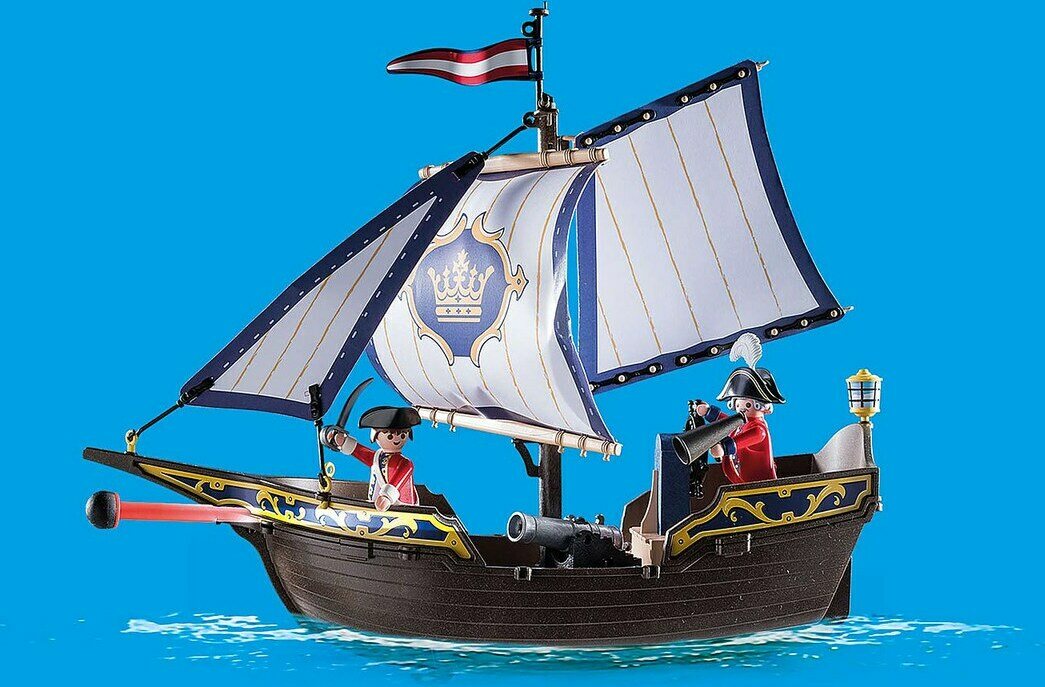 Merirosvot olisivat mielellään maailman merien herroja, mutta nokkelilla punatakeilla on jotakin sitä vastaan. Sotalaivallaan he ottavat vastaan jokaisen haasteen. "Tuolla, merirosvot edessä!", huutaa komendantti. Sotilaat asettava kanuunat paikoilleen. Kuula sisään ja tulta! Näitä punatakkeja vastaan merirosvoilla ei ole mitään mahdollisuuksia. Merirosvo kulta-aarteineen otetaan kiinni ja viedään sotilaslinnoitukseen. Pystyykö miehistö vielä vapauttamaan merirosvokapteenin? Leikkisetti sisältää purjelaivan ja lautan, jossa kanuuna, kolme PLAYMOBIL-hahmoa, kirstun, aarrekartan, sekstantin ja paljon muuta. Laivan kannella ja lautalla on kiinnityspaikkoja hahmojen parempaan kiinnittämiseen. Laiva on uiva ja sen voi varustaa vedenalaisella moottorilla (9853).