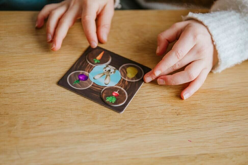 JUNIOR-peliversiossa autat omaa kaniasi loikkaamaan tyhjälle lehdelle liikuteltavaan riviin. Liu'uta riviä ja kurkista, mitä avoimesta kolosta paljastuu! Jos kolosta paljastuu vihannes, jota sinulle ei vielä ole, voit poimia sen. Jos kolosta puolestaan paljastuu sinulla jo oleva vihannes tai jos kolo on tyhjä, vuoro siirtyy seuraavalle pelaajalle. Pelaaja, joka saa kaninsa kanssa kerättyä ensimmäisenä keräilykorttinsa neljä eri vihannesta, voittaa pelin!