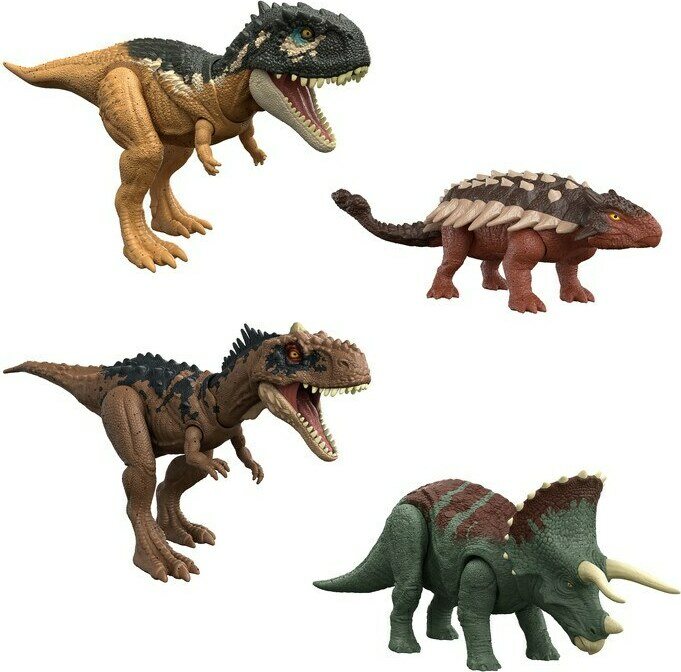 Dinosaurukset ovat karanneet ja ne ovat hurjalla päällä. Ne karjuvat ja niillä jokaisella on oma taisteluliikkeensä. Dinon koko n. 33 x 14 cm. Sisältää paristot 3 x LR44. Useita erilaisia. Ikäsuositus yli 4-vuotiaille.