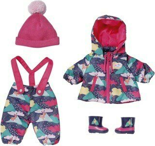 Värikäs talviasusetti 43cm nukelle. Sisältää toppatakin, toppahousut, pipon ja kengät. Ikäsuositus: 3+ vuotta