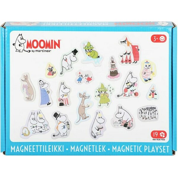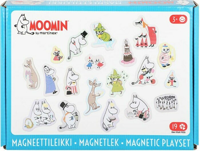 Magneettileikin hahmoista löytyy mm. eväsretkellä olevat Niiskuneiti ja Muumipeikko, lyhtyä kantava Tuu-Tikki ja samoin Muumipappa, kakkua kantava Niiskuneiti, lapiolla kaivava Muumipappa, värikkäitä paperilyhtyjä kantavat Muumipeikko ja Pikku Myy, kissaa silittävä Muumimamma, huiluaan soitteleva Nuuskamuikkunen myös rantatuolissaan istuskeleva Nuuskamuikkunen sekä monta muuta. Pikku Myy nakertaa herkkuja ja toisessa kantaa värikkäitä paperilyhtyjä. Iloisiin hetkiin!