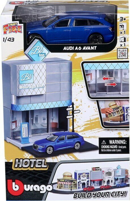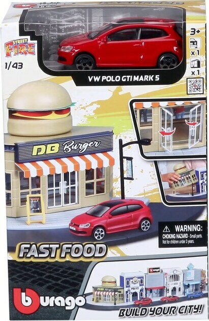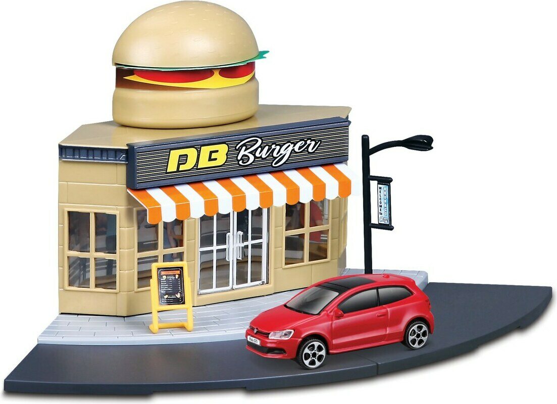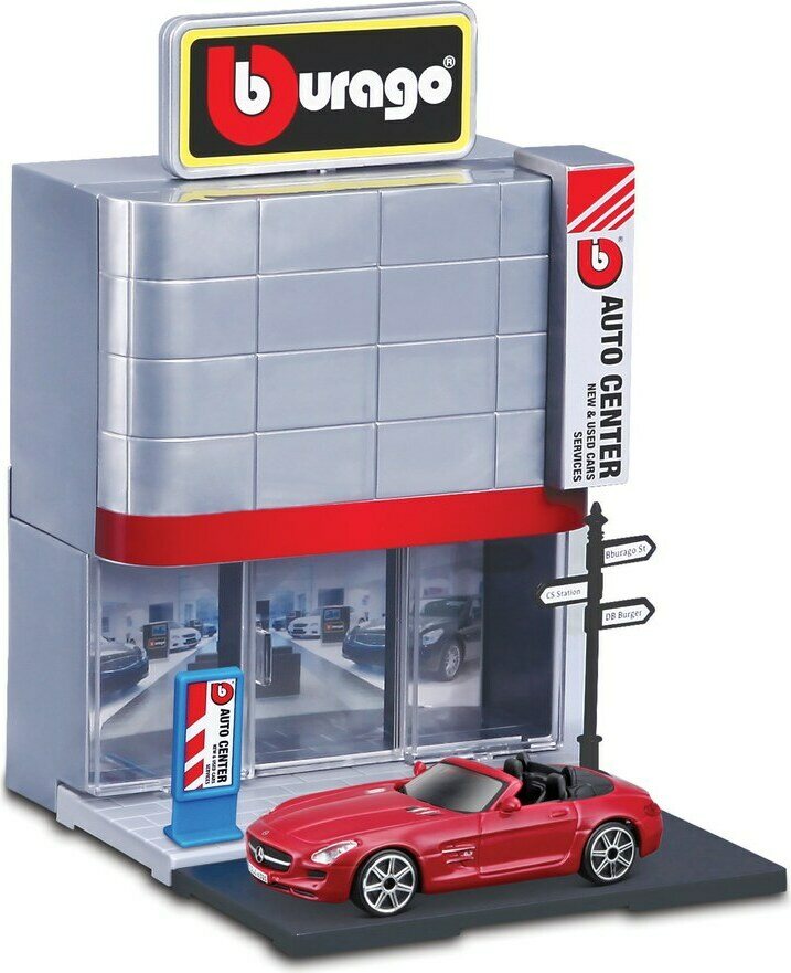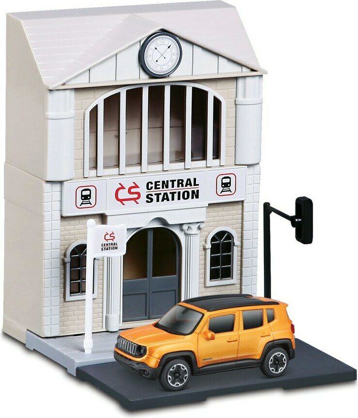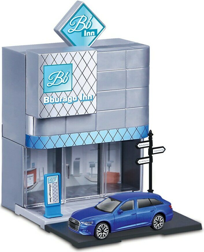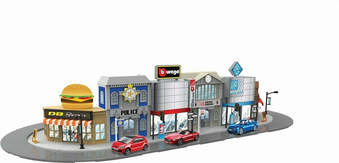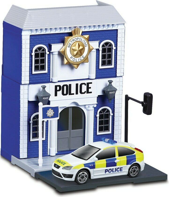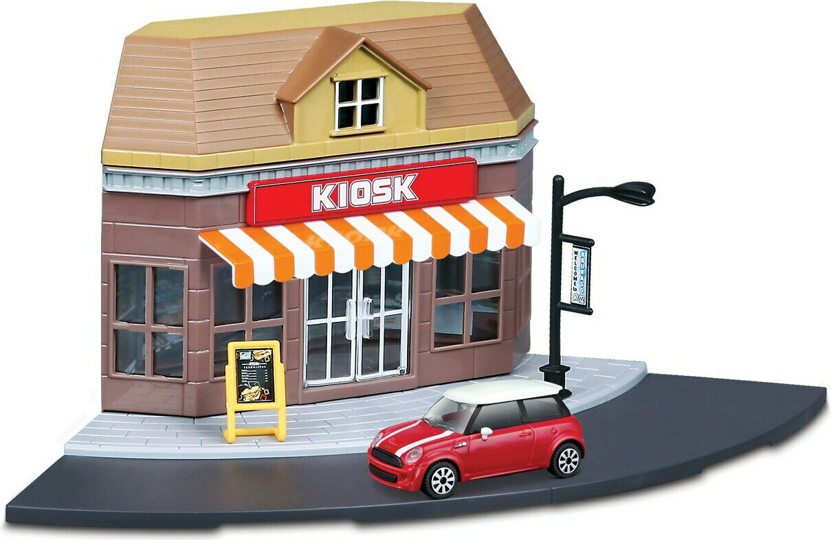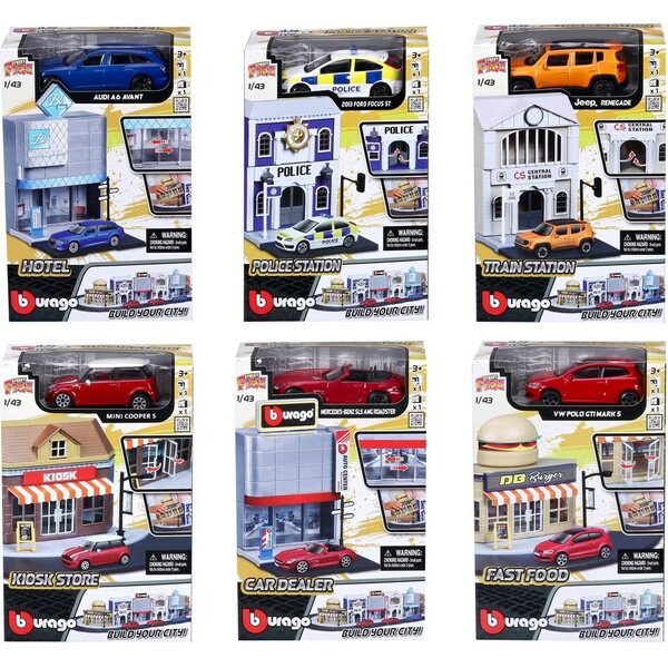 Descrizione del prodottoLajitelmassa kuusi erilaista leikkisettiä; pikaruokala, poliisiasema, autokauppa, juna-asema, hotelli ja kioski. Hinta sisältää yhden leikkisetin. Pakkauksessa mukana yksi 1:43 auto.