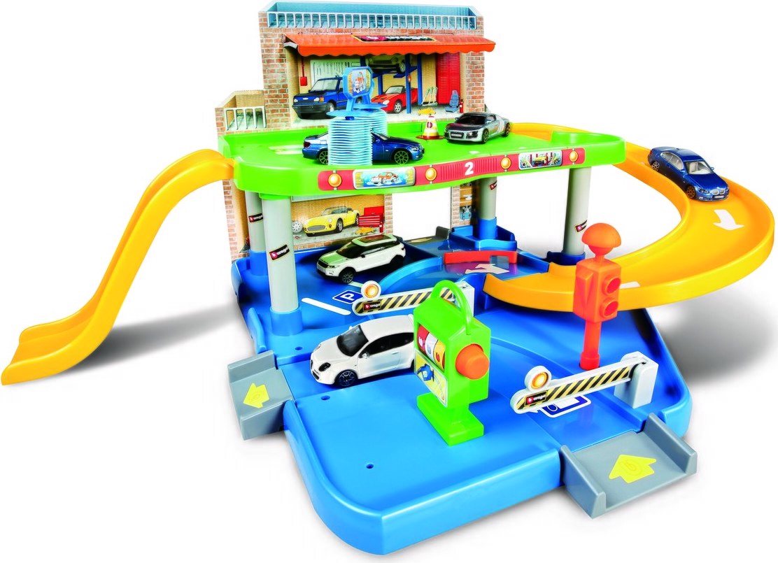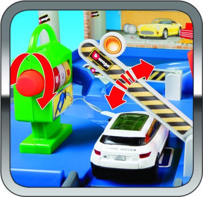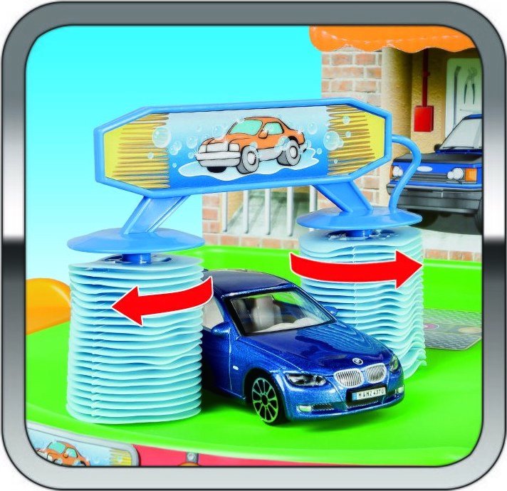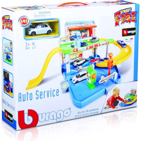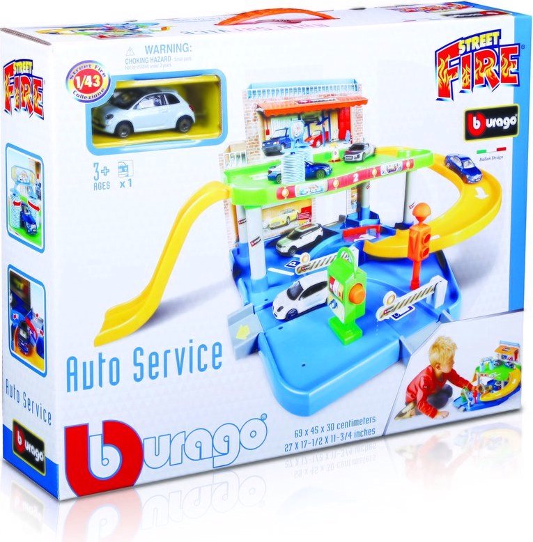 Kootun tuotteet mitat 69 x 45 x 30 cm. Kaksitasoinen autohuolto sisältää mm. tankkauspisteen ja pesupaikan. Sisältää yhden pikkuauton. Ikäsuositus 3+.