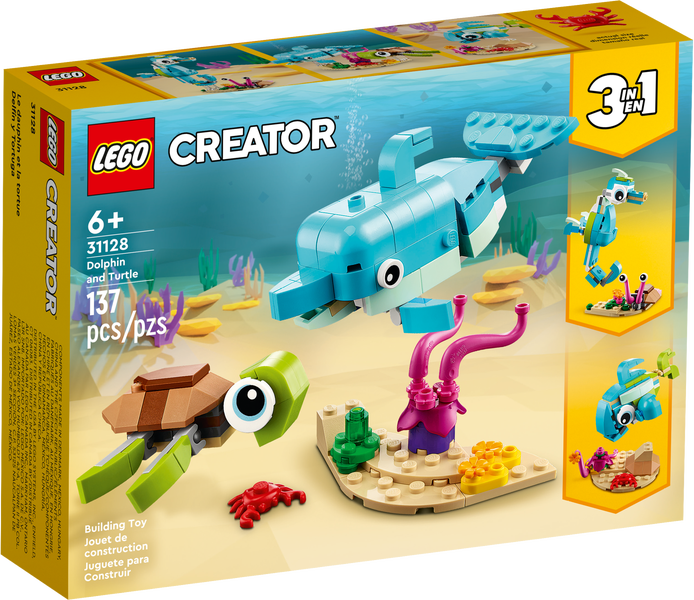 Descrizione del prodotto6 vuotta täyttäneet LEGO® fanit voivat sukeltaa merenalaisiin seikkailuihin tämän Delfiini ja kilpikonna (31128) 3in1-rakennussetin parissa. Delfiininpoikasen evät, leuan ja pyrstön ja merikilpikonnanpoikasen räpylät ja pään voi laittaa eri asentoihin. Kiinnitä molemmat mallit sitten esittelyjalustalle.