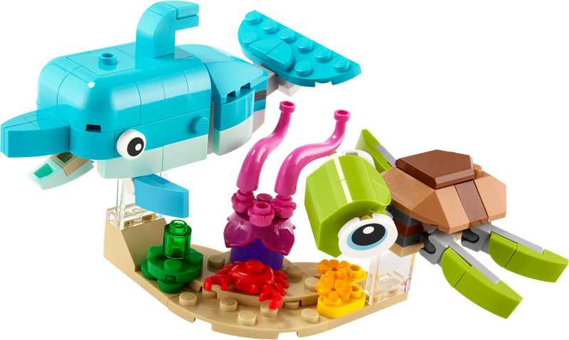 LEGO Creator 3in1 setin 3 merieläinlelun parissa riittää yllin kyllin merenalaisia hupihetkiä. Setin osista voi rakentaa liikuteltavan delfiinin ja kilpikonnan, merihevosen ja kotilon tai söpön kalan ja ravun. Tai anna luovuuden lentää ja rakenna kokonaan uusi eläin.
