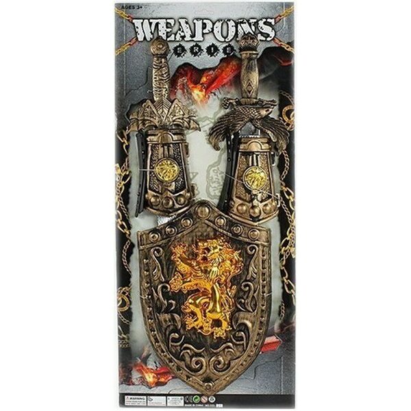 商品説明Antiikin ajan tarunhohtoinen miekkasetti! Pakkaus sisältää kaksi 52cm pituista miekkaa, kaksi rannesuojaa sekä kilven kultaisilla koristeilla. Ikäsuositus 4+ vuotta. Tuotteen mittatiedot: 63 x 28 x 3 cm – 0,359 kg