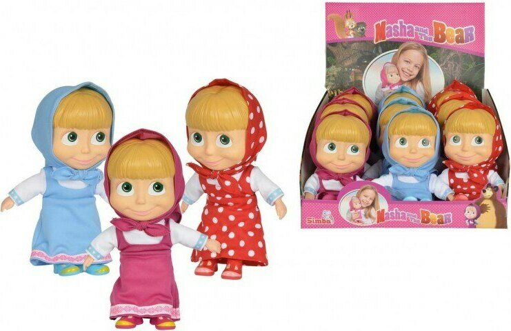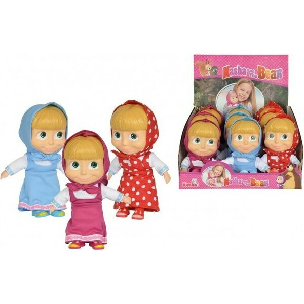 Masha and the Bear sarjan Masha-nukke. Saatavilla monissa eri asusteissa, kirjoitathan viestikenttään mahdollisen asuste toiveen. Keskivartalo on pehmeä, muut ruumiinosat muovia. Ei suositella alle 3-vuotiaille.
