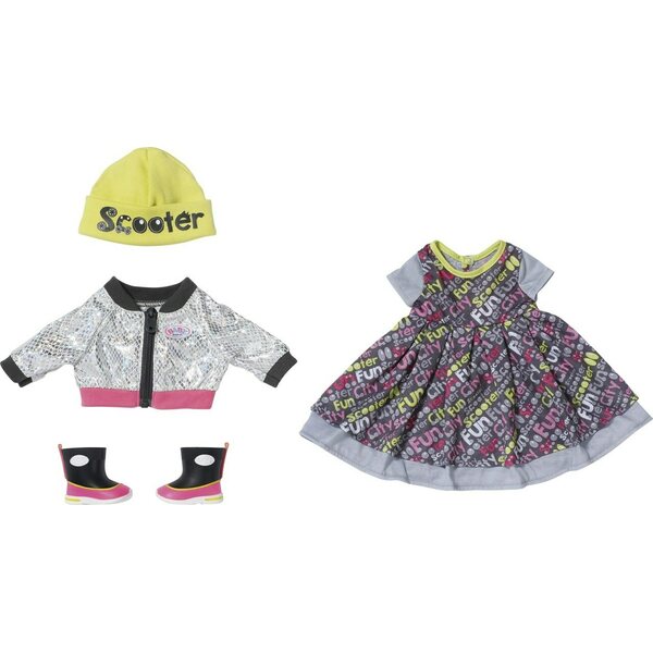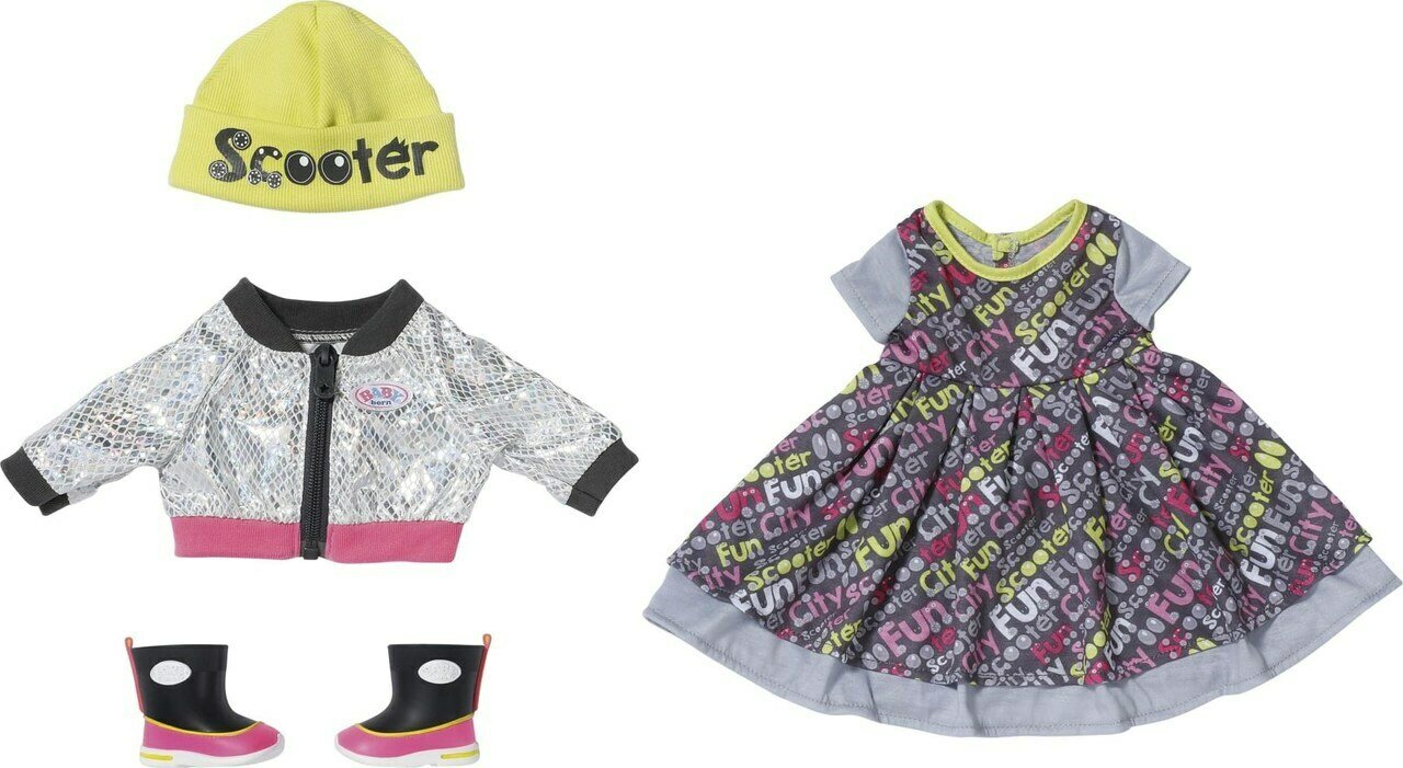 Asusetti 43 cm nukelle. Mukana takki, mekko, pipo ja kengät. Ikäsuositus: 3+ vuotta