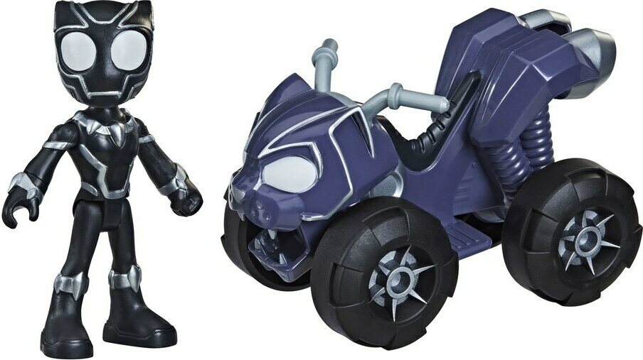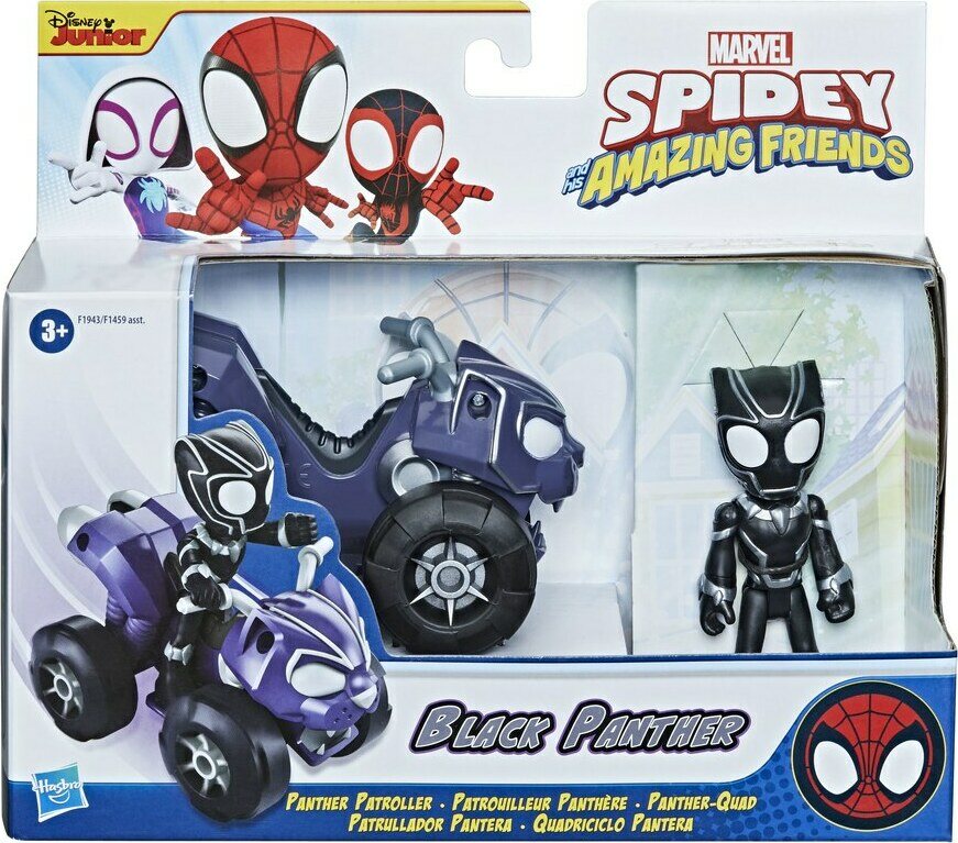 10 cm Spidey and His Amazing Friends -toimintahahmo Black Panther ja mönkijä. Hahmolla viisi nivelpistettä. Sisältää hahmon ja ajoneuvon pyörillä. Ikäsuositus 3+.