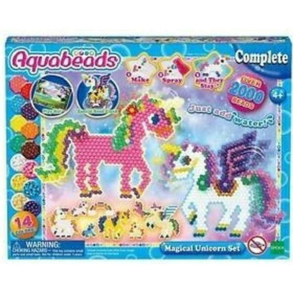 Ihmeellinen Yksisarvinen Aquabeads -setti sisältää yli 2000 helmeä ja 14 väriä. Paketin mukana tulee myös leikkimatto, seisontatuki, sumutin sekä siipimalli. Valmis teos suihkutetaan vedellä, eikä tekemiseen tarvita lämpöä.