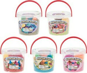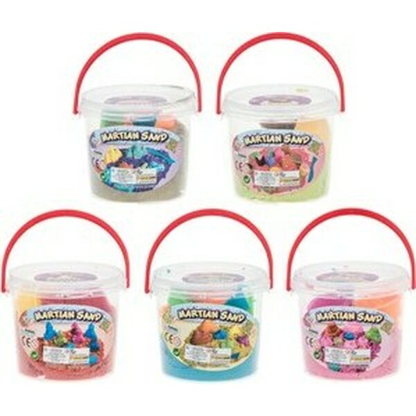 Kimallehiekka sankossa löytyy myös muotit rakenteluun. Hiekkaa saatavissa eri väreissä.