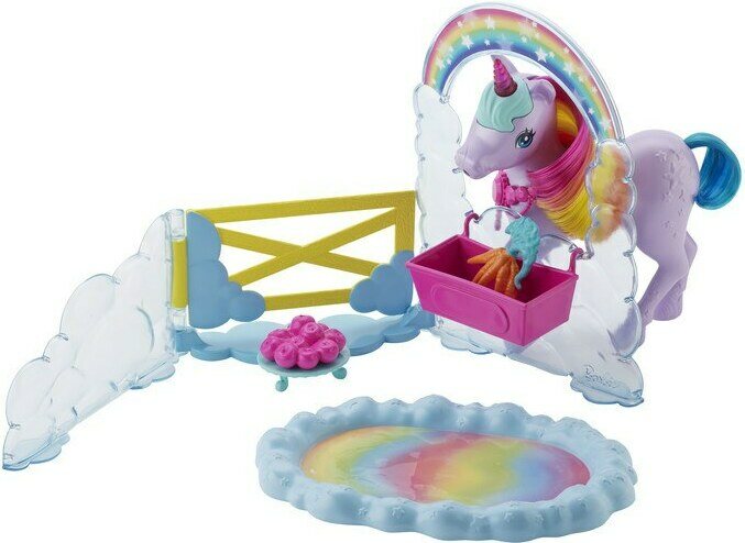 Sateenkaaren väreissä hehkuva Barbie Dreamtopia leikkisetti sisältää Barbien, hoivattavan yksisarvisen ja runsaasti erilaisia hoitotarvikkeita. Juota yksisarvista vedellä ja katso, kuinka pilvenmuotoinen alusta vaihtaa väriä. Ikäsuositus 3+.