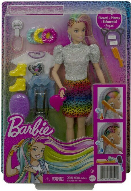 Näyttävä Barbie viihtyy huomion keskipisteenä. Kastele pitkät sateenkaaren väriset hiukset kylmällä vedellä ja katso, kuinka ne muuttuvat pantterikuvioisiksi.Pakkauksessa mukana kaksi toppia, kengät ja erilaisia asusteita, joilla täydennät tyylin. 3+