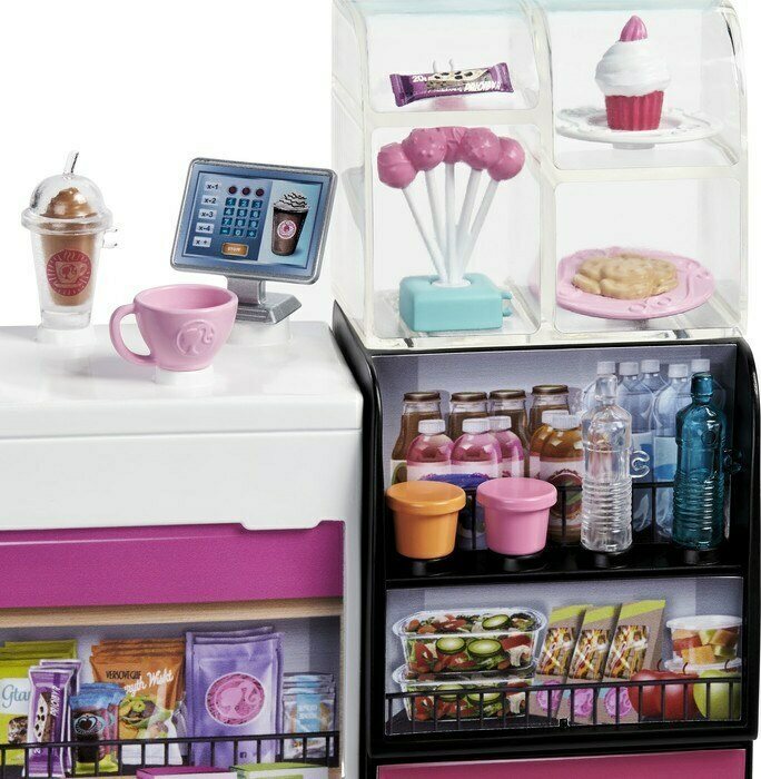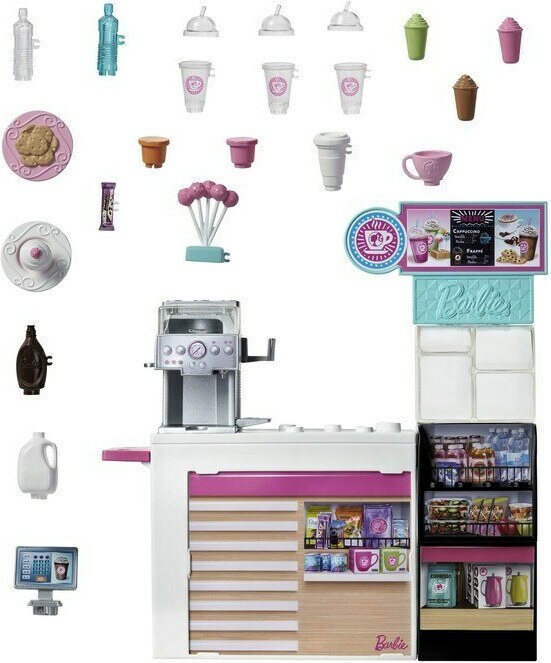Barbie tarjoilee kahvilassaan ihania herkkuja, maistuvia välipaloja ja virkistäviä juomia. Kauniita yksityiskohtia sisältävässä leikkisetissä on yli 20 osaa. Pakkaus sisältää nuken, kahvilan tiskin ja runsaasti erilaisia tarvikkeita. Ikäsuositus 3+