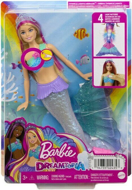 Häikäisevän merenneito-Barbien pyrstö alkaa vilkkua sateenkaaren väreissä, kun upotat sen veteen tai painat nuken topissa olevasta napista. Kaunis tiara ja koristeltu pyrstö. Neljä erilaista värikästä valoasetusta! Paristot 3 x LR44 sisältyy. 3+