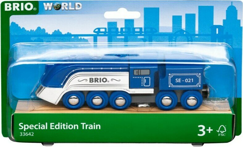Brio vuoden 2021 erikoisjuna. Junassa metallisia yksityiskohtia. Väri sininen. Ikäsuositus 3+.