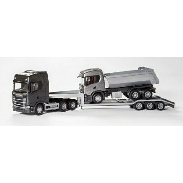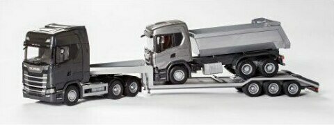 Scania CS lavetti ja uutuus Scania G500 maansiirtoauto. Lavetissa on käännettävä ajoramppi ja tukijalat. Maansiirtoautossa takapyöräjousitus ja kippitoiminto. Lavetin koko 68 cm, maansiirtoauton 32 cm. Mittakaava 1:25. Ikäsuositus 3+