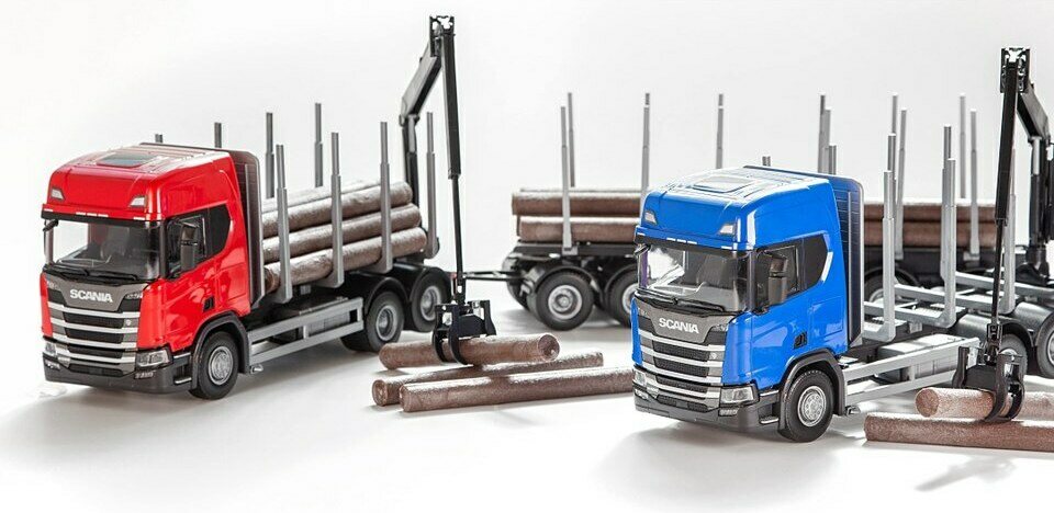 Scania tukkirekka, jossa korotettu H-hytti. Mukana tukkien lisäksi liikuteltavat pankot, tukkinosturi sekä peilit. Vetoautossa takapyöräjousitus. Värilajitelma; sin. ja pun. Toimitamme värin varastotilanteen mukaan. Tuotteen koko 77 cm, ikkunapakkaus. Mittakaava 1:25. Ikäsuositus 4+.