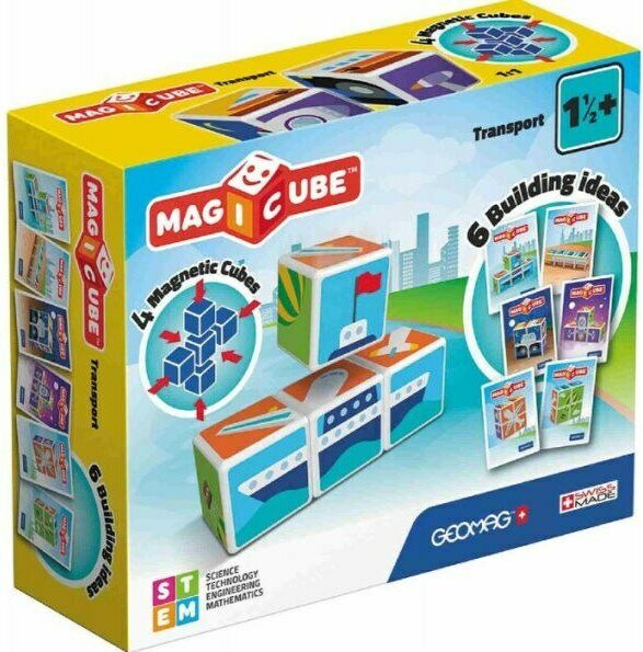 Geomagin magneettikuutiot, jotka kiinnittyvät toisiinsa. Paketissa mukana neljä magneettikuutiota ja 6 erilaista rakennusideaa. Ikäsuositus: 1+ vuotta
