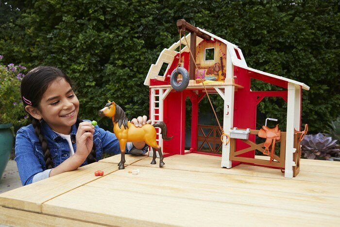 Spiritin tallilla viihtyvät ystävät ja hevoset. Hoida hevosta karsinassa ja nouse sitten yläkerran kerhotilaan hauskalla rengaskeinulla. Tallin koko n. 40 x 50 cm. Settiin kuuluu talli, hevonen ja hevosenhoitotarvikkeita. Nukke myydään erikseen. 3+