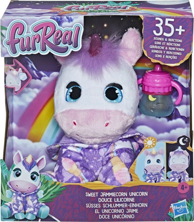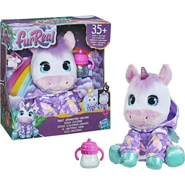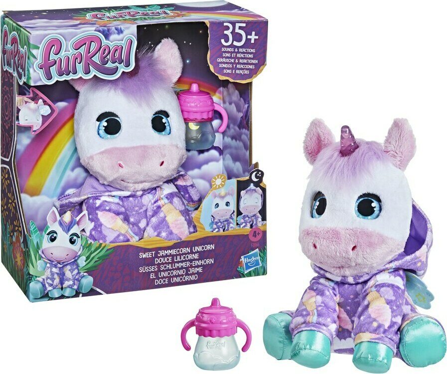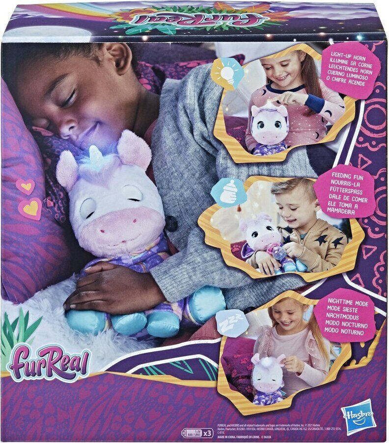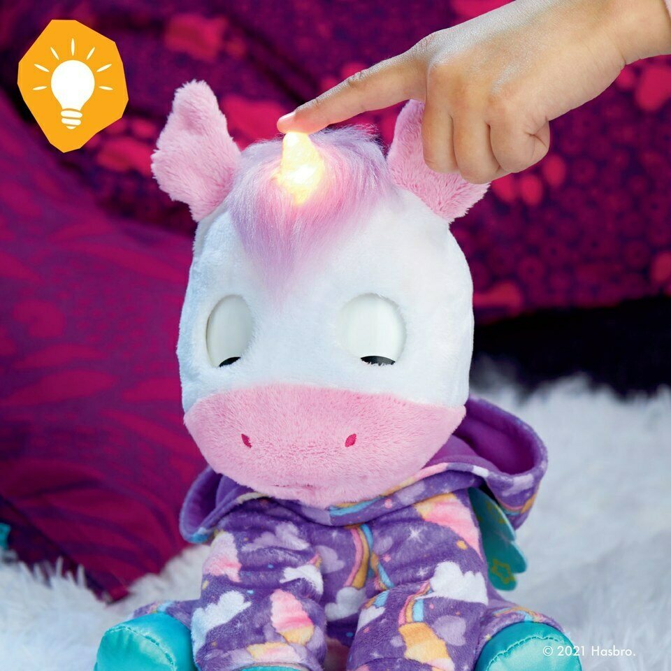 Yli 35 erilaista toimintoa, kehtolauluja ja rauhoittavaa valkoista kohinaa, syömisääniä, väriä vaihtava sarvi. Mukana tuttipullo, jolla unilelua voi syöttää. Ikäsuositus 4+.