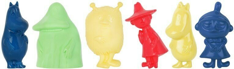 Tuotteen kuvausMuovimuottien hahmoina ovat Muumipeikko, Niiskuneiti, Pikku Myy, Nuuskamuikkunen, Mörkö ja Haisuli. Muotin korkeus on 10-12 cm.