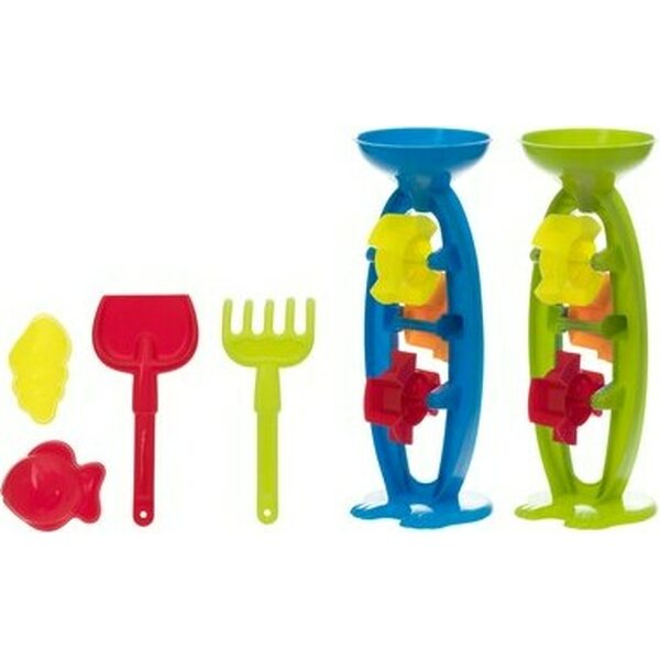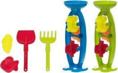 17 x 12,5 x 34 cm. Lajitelmassa sininen ja vihreä. PP. Myllyssä kolme pyörää, joiden läpi hiekka tai vesi valuu.