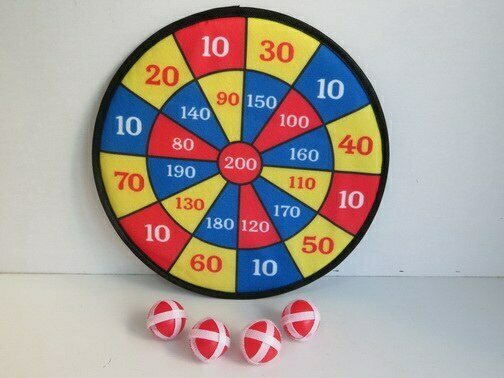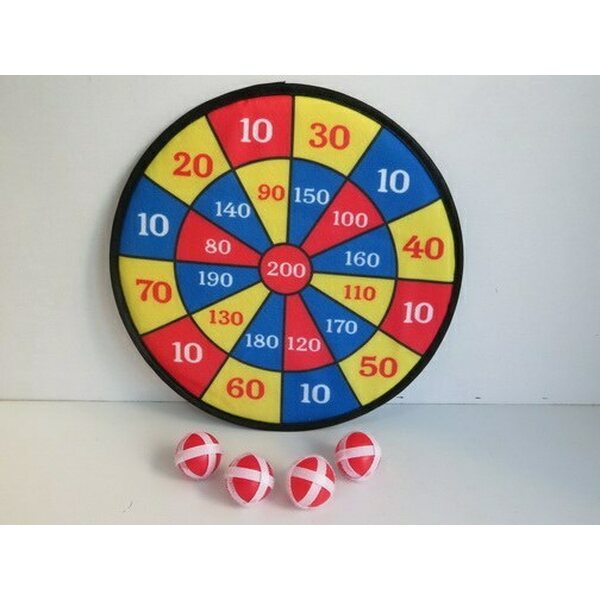 Tarratikkataulu ja 4 tarrapalloa, jotka kiinnittyvät tauluun. Taulun halkaisija noin 32cm.