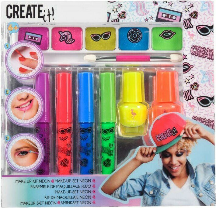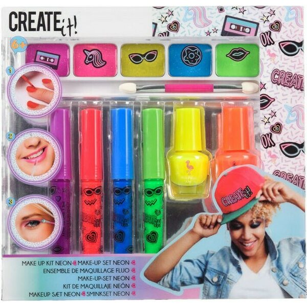 Neon meikkisetti silmille ja kynsille. Pakkauksessa on neon luomivärit, kynsilakat ja huulimeikit. Ikäsuositus 6+.