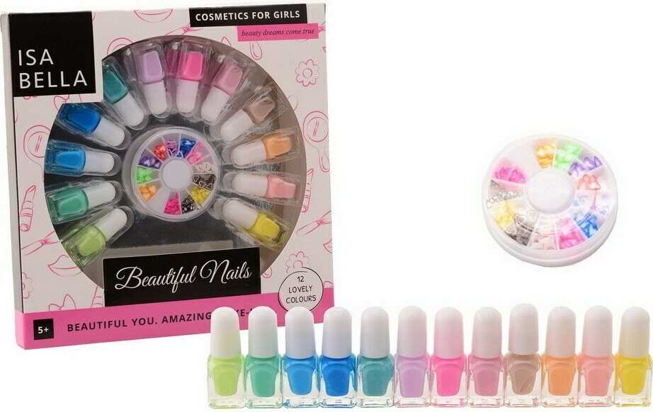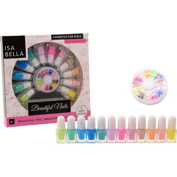 Kynsien koristeluun runsas setti, sisältää 12 eri väristä kynsilakkaa. Merkki: Isabella. Tuotteen mittatiedot: 21 x 21 x 2,5 cm – 0,242 kg.