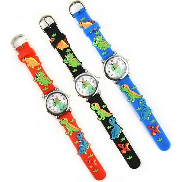 Lasten rannekello dinosaurus kuviolla. Väreinä musta, punainen ja sininen.