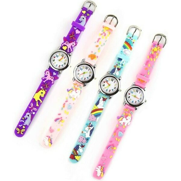 Lasten rannekello yksisarvis kuvioilla. Värivaihtoehdot: violetti, valkoinen, sininen ja vaaleanpunainen.