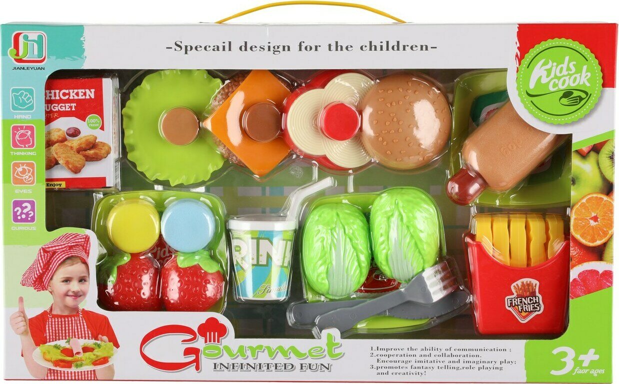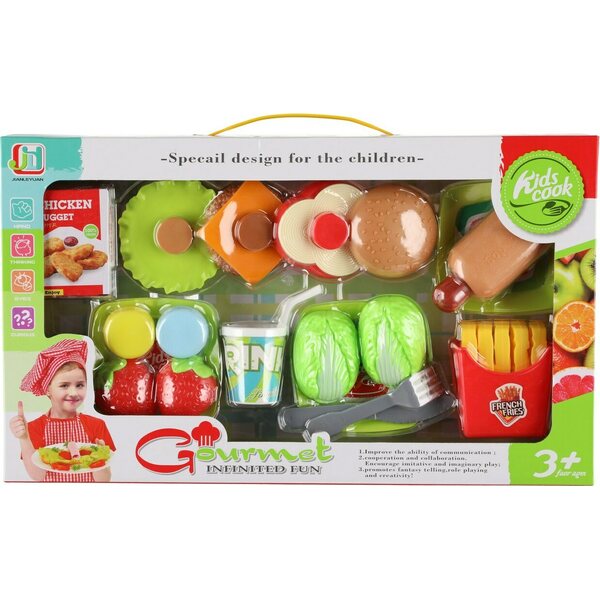 Setti sisältää leikkiruokaa ja aterimet. Mukana myös jälkiruoat. Voit leikata ruokia. Ikäsuositus 3+.