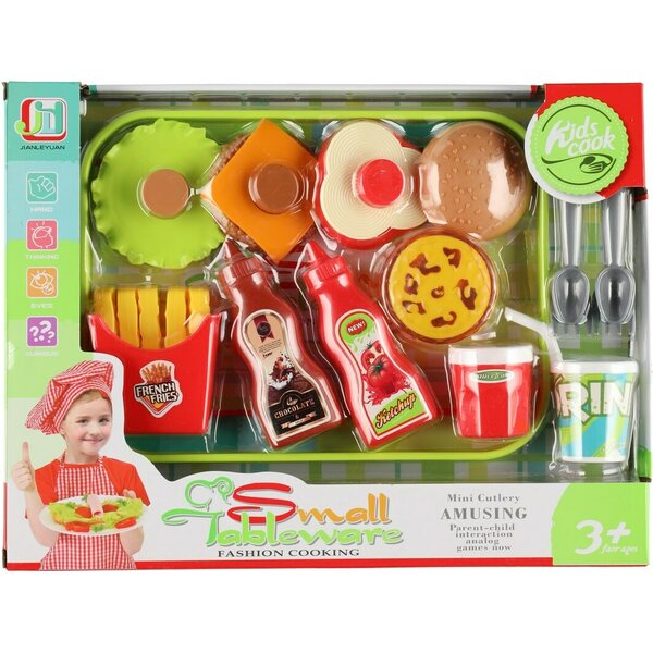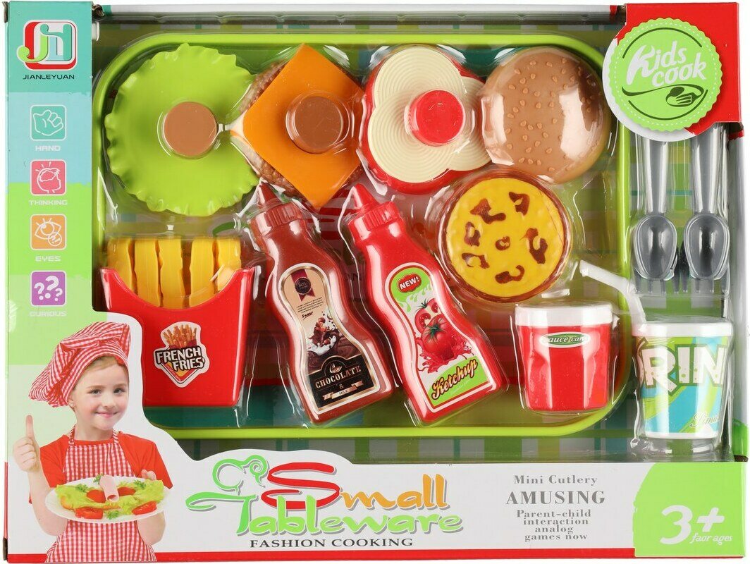 Setissä tarjotin, leikkiruokia ja juomapullo. Ikäsuositus 3+.