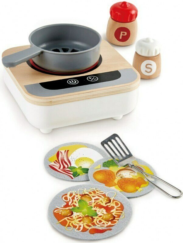 Tuotteen kuvausHieno ilmalla toimiva keittolevy lasten leikkeihin. Keittolevyn sisällä on tuuletin, joka käynnistyy nappia painamalla. Tuulettimen ollessa päällä paistinpannulla oleva ruoka alkaa liikkua. Pakkaus sisältää lisäksi mm. sirottimet sekä erilaisia ruokakiekkoja (Ø 9 cm). Materiaali: puu, huopa, metalli. Tuotteen koko: 18x18x7 cm. Paketin koko: 30x8x24 cm. Paristot 4xAA eivät sisälly pakkaukseen. Ikäsuositus: 3+.