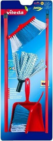 Vileda siivoustarvikesetti. Setissä moppi, harja ja rikkalapio sekä -harja.