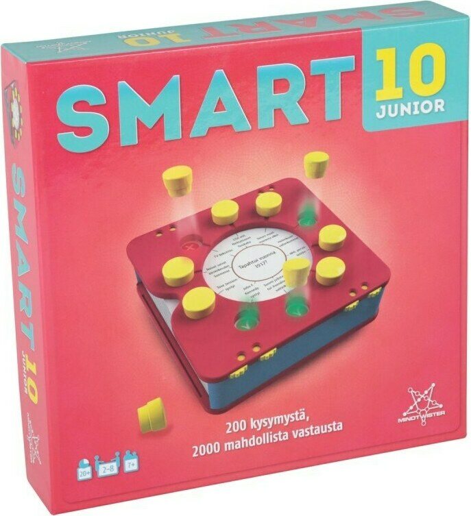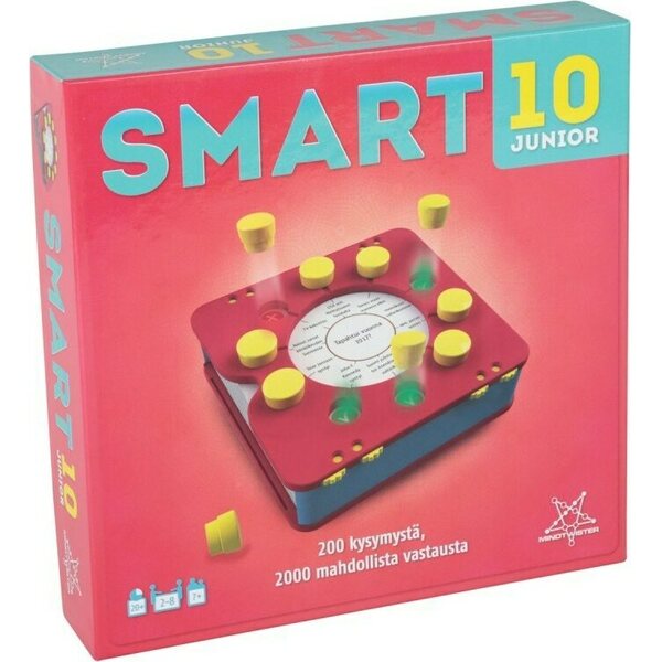Tuotteen kuvausSmart10 JR on uuden suositun tietopelin junioriversio, joka on suunnattu ala-asteikäisille pelaajille. Pelissä ei tarvitse odotella pitkään omaa vuoroaan. Jokaiseen kysymykseen on 10 vastausvaihtoehtoa, ja kaikki pääsevät vastaamaan jokaiseen kysymykseen. Jokaisesta oikeasta vastauksesta saa vastausmerkin, ja kierroksen lopulla niistä merkitään jokaiselle pisteet. Jos on epävarma, voi kysymyksen passata ja pitää jo kerätyt vastausmerkit. Kunkin kierroksen pelimerkit ja pisteet voi kuitenkin menettää, jos vastaa väärin – koko pistepotti ei kuitenkaan mene tyhjäksi, vaan edellisten kierrosten pisteet säilyvät.Kuka pelaa riskillä? Kuka tallettaa vastausmerkit ajoissa? Kuka ahnehtii? Onko passaaminen ja maltti valttia? Kätevästi mukana kulkevaan Smartboxiin mahtuu 200 kysymystä vastauksineen, pistelaskurit ja vastausmerkit, muuta ei tarvita. Peli on näppärän kokoinen: helppo säilyttää ja ottaa mukaan minne tahansa!Smart10-peliä pelanneiden kommentteja: "Kiva peli! Hyvä pelilogiikka! Nopea! Tasapuolinen! Etenee sujuvasti, ei junnaa! Mielenkiintoiset teemat ja kysymykset! Pelataan uudelleen! Pelataan vielä! Tiedän mitä annan lahjaksi!"Peli-iloa kaikille!